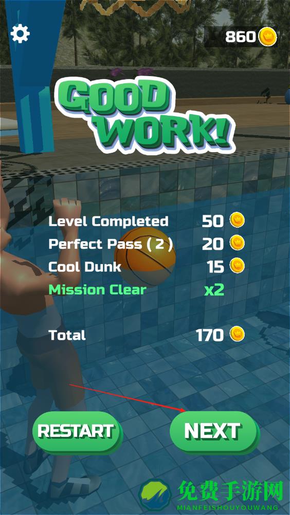3、完成投篮任务后,会根据扣篮,传球,以及进球时间等进行评分,以此获取奖励来购买篮球皮肤,泳池样式,以及角色装扮。