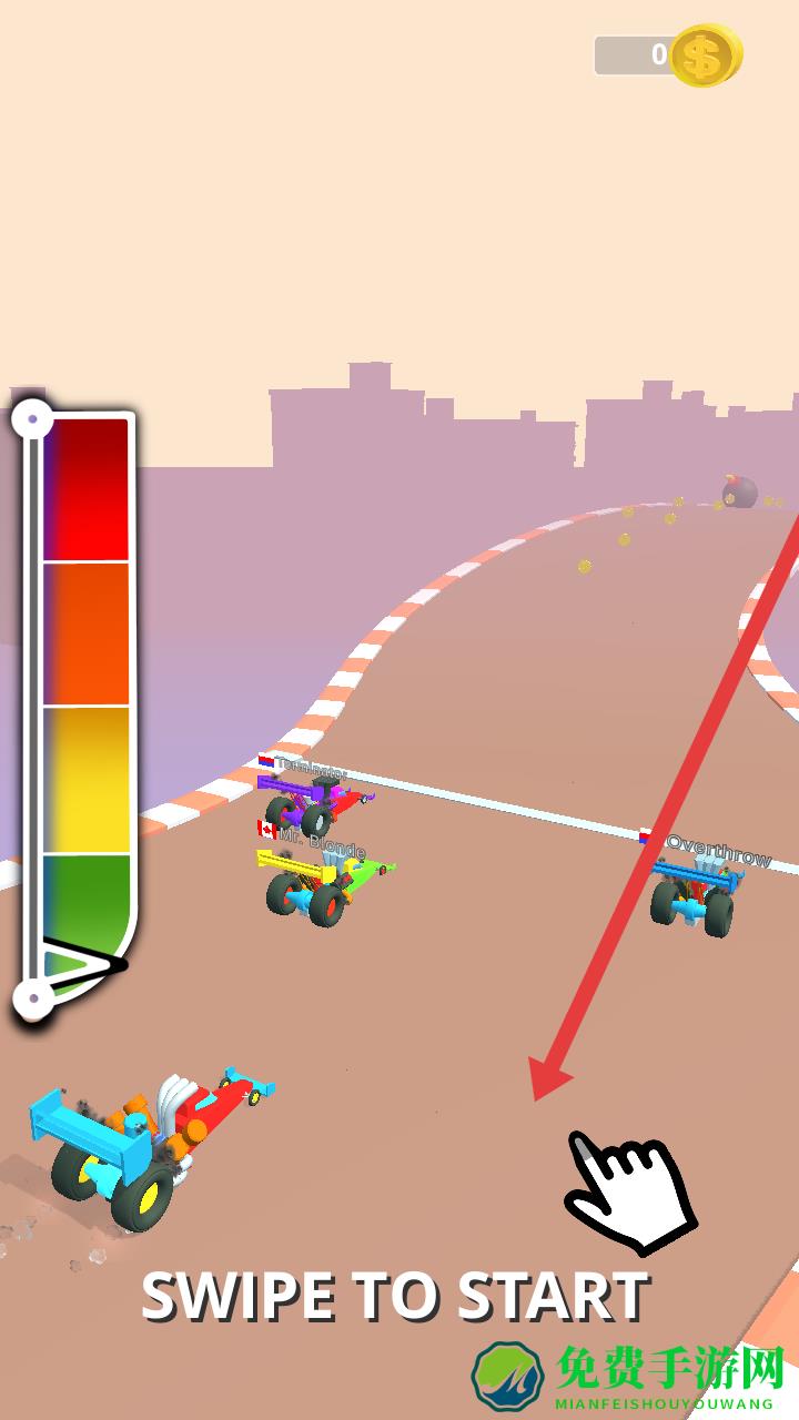 1、滑动屏幕触发SWIPE TO START,开启赛车比赛,进入赛道后需做好起步准备,通关滑动屏幕进行控制。