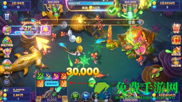 4、激光:当玩家们使用一定次数的时候可以触发激光炮,这时候就可以等待大鱼或者金色的鲨鱼游来,然后直接发射激光来赚取大量的金币。