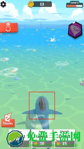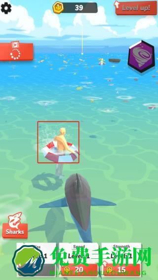 2、追击并攻击浮于救生圈的人类,成功捕食后积累金币,推动鲨鱼等级提升,解锁属性升级权限。
