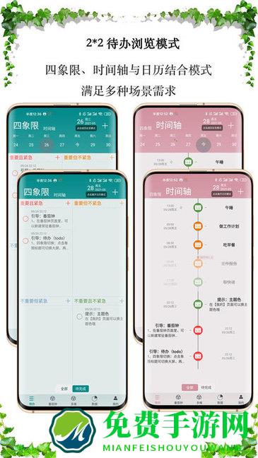 4、独特的四象限、时间轴与日历结合的2*2模式,让您可以从整体、单日维度,以四象限或者时间轴来浏览待办事项。