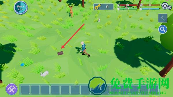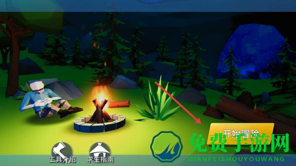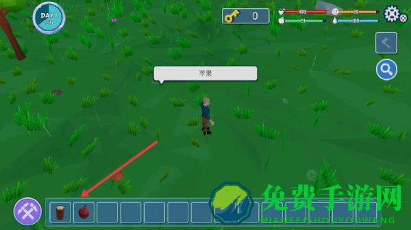 1、点击主界面开始冒险,进入生存场景,操控角色在草地探索,收集木材、苹果等基础资源。