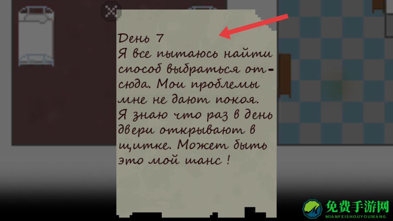 1、进入游戏场景后,查看День7的日记内容,从中获取每日晨间开门的逃生线索,规划脱逃时机。