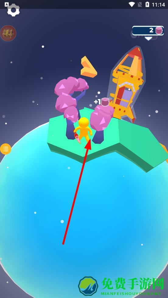 1、进入星球,操控角色靠近粉色树木等资源,靠近后,自动砍伐点击触发采集,收集能量桶储备火箭材料,奠定发展基础。