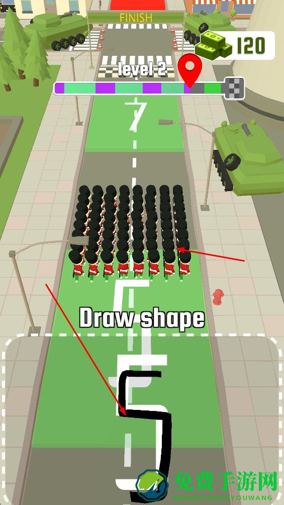 2、在道路上,人群将按照绘制的形状排列移动,避开障碍持续推进,为抵达终点奠定基础。