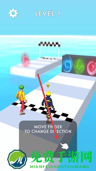 1、进入游戏关卡,按提示MOVE FINGER TO CHANGE DIRECTION,滑动手指调整角色行进方向。