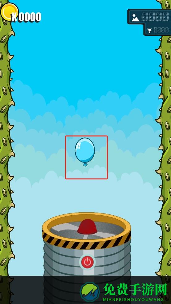 1、蓝色气球悬浮空中,下方有带红色按钮的装置,需观察气球位置,等待时机操作,让气球避开两侧带刺植物。