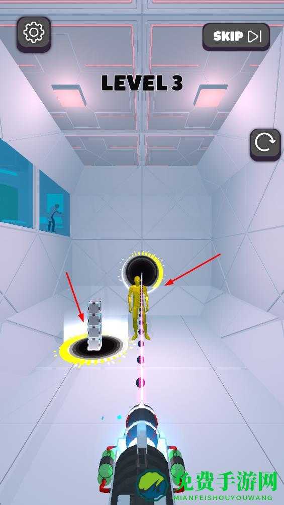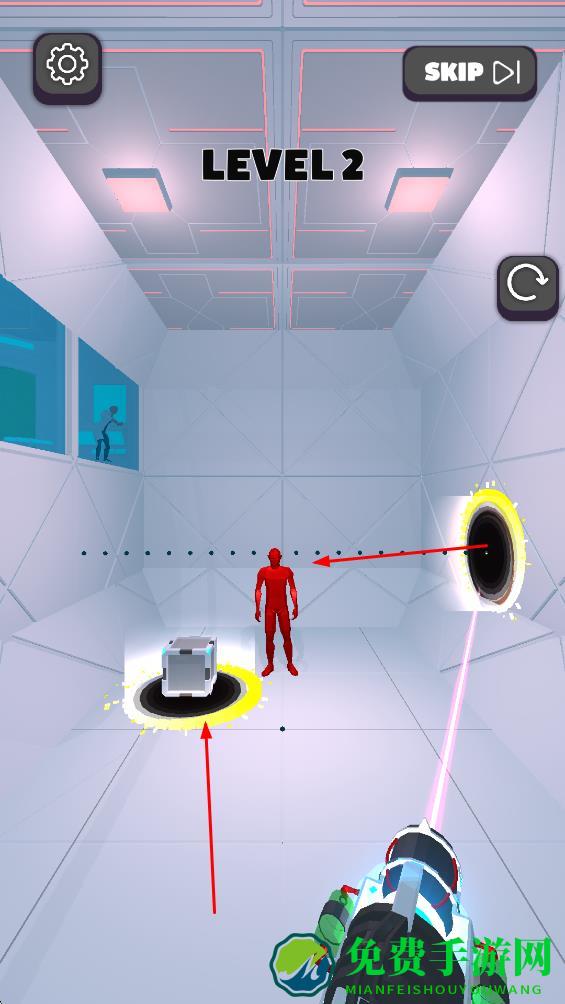 2、射击生成两个传送门,让箱子传至角色旁挡激光,角色借另一传送门避险,突破障碍。
