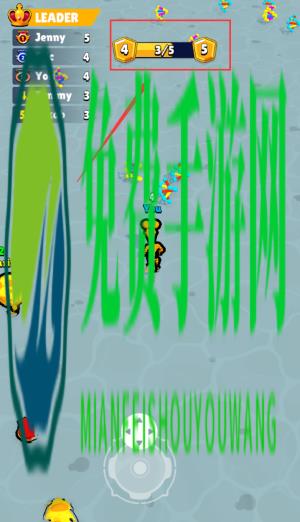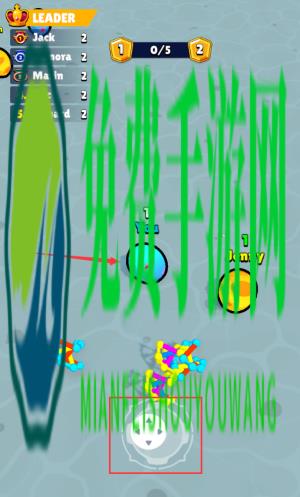 2、使用红框虚拟摇杆,操控蓝色角色移动方向。