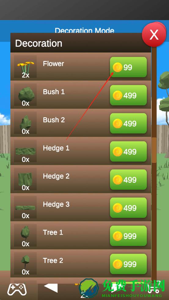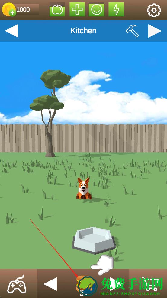 3、进入装饰界面,花费金币购买花朵、灌木等装饰,布置花园,让花园看起来不再那么光秃秃,狗狗的心情好起来,也会增长亲密度。