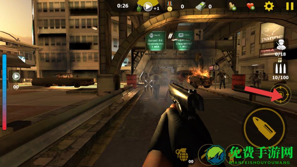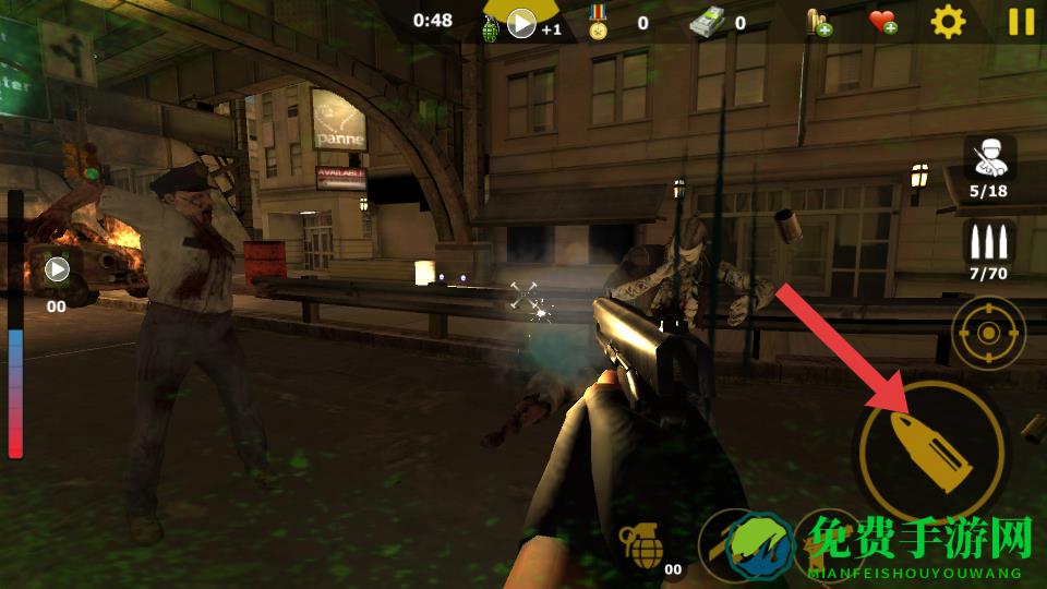 2、遇到大量丧尸,点击右侧的换弹按钮补充弹药,若被包围,可以使用手雷,下方手雷的图标。