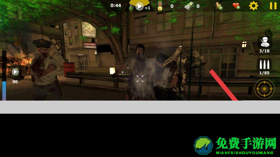 1、进入了游戏,操控角色持枪,瞄准街道的丧尸,点击右侧的射击的按钮,优先来攻击靠近的丧尸。
