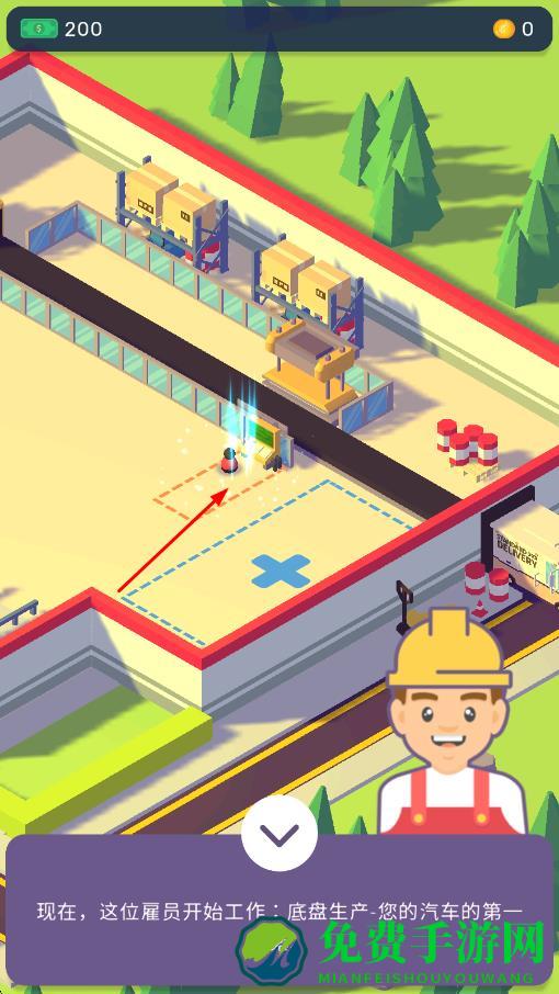 1、进入游戏后选择初始工厂区域,放置基础汽车生产线,启动设备开始生产,通过售卖汽车获取初始金币收益。