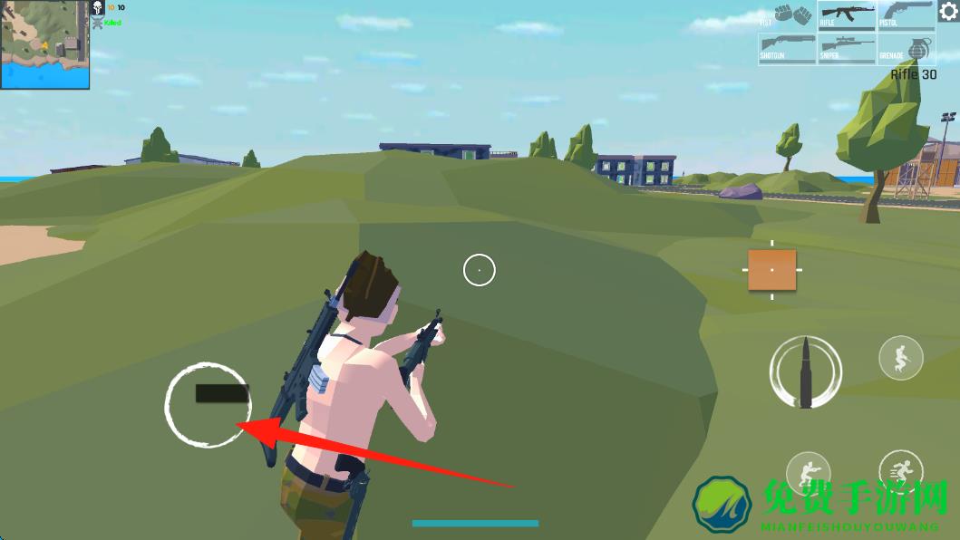 2、游戏中操控左侧虚拟摇杆,控制角色在草地地形移动,规划行进路线搜寻目标,拨动轮盘移动。