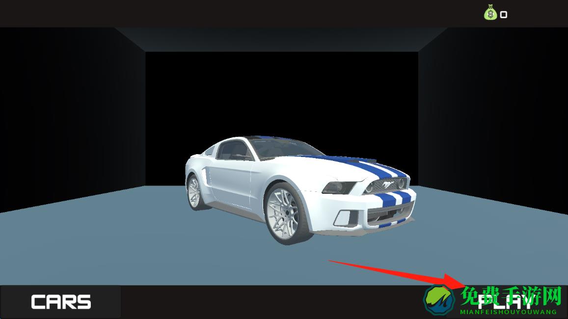 2、进入车辆选择界面,点击右下角PLAY按钮,确认白色带蓝条纹跑车并进入驾驶场景,点击加速。