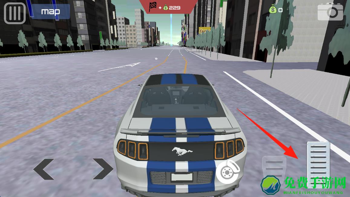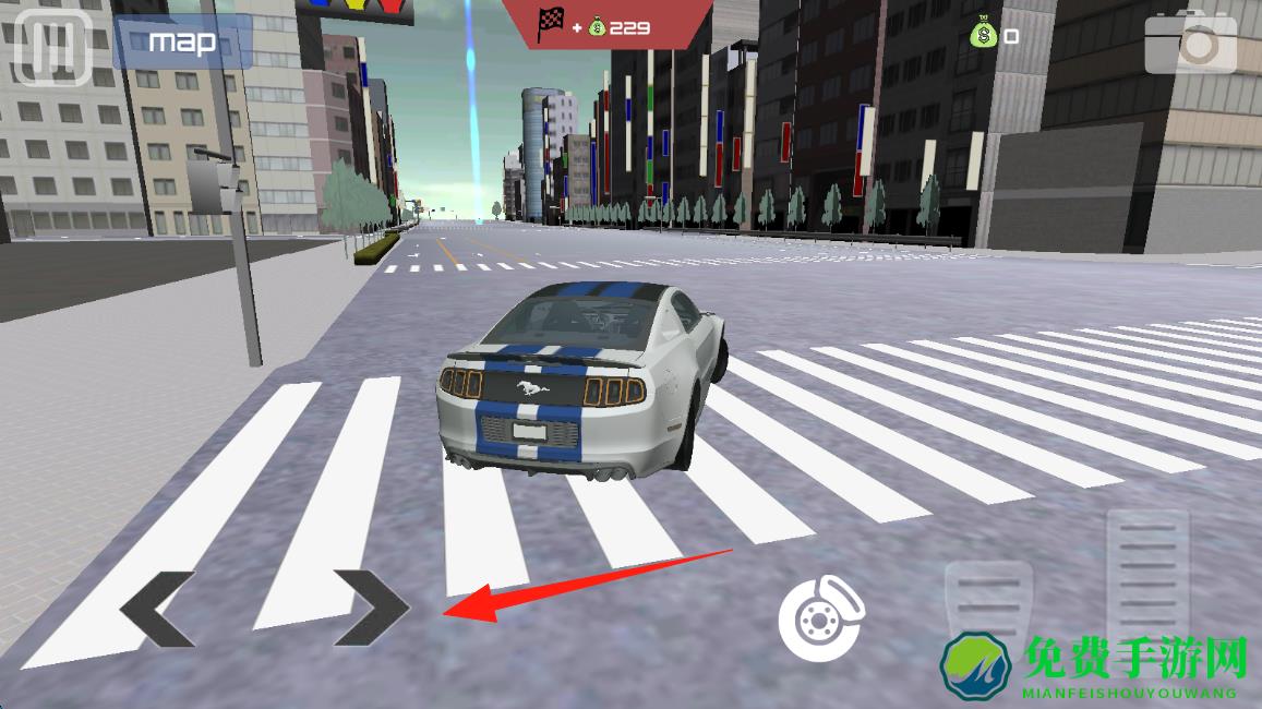 3、在城市道路驾驶时,点击右侧加速踏板按钮,控制跑车加速前行,完成赛道任务,点击转弯。