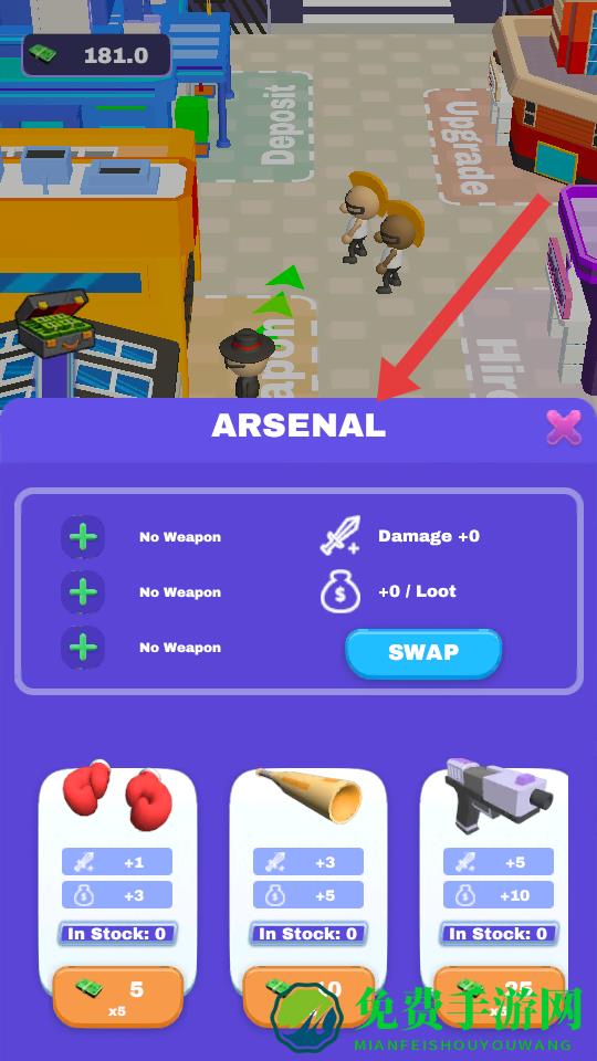 1、进入ARSENAL武器库界面,查看当前无武器状态的属性,依据现有金币181,选择花费5金币购买手套、10金币购买喇叭或25金币购买枪。