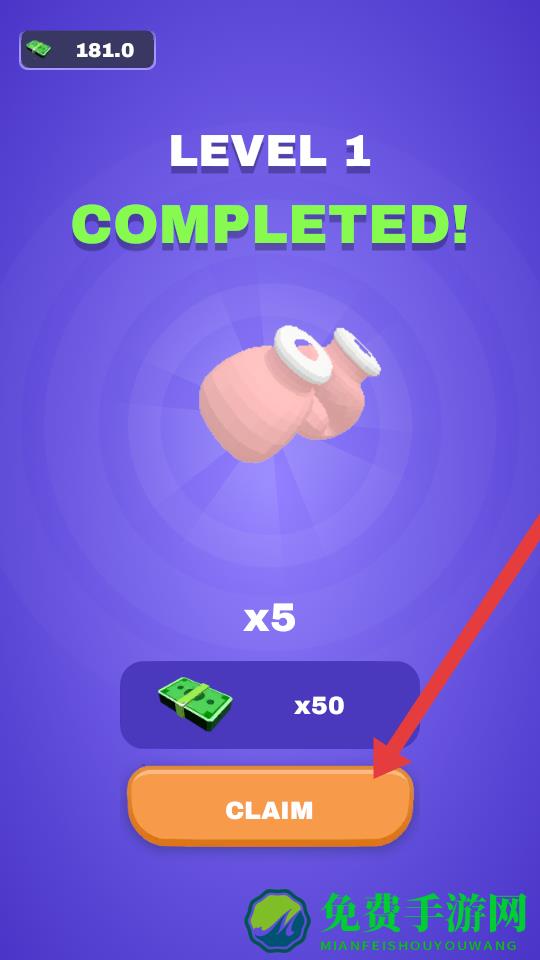 3、完成LEVEL1关卡后,可以领取奖励,手套×5与金币×50,点击橙色CLAIM按钮收取奖励,积累资源用于后续武器购买。