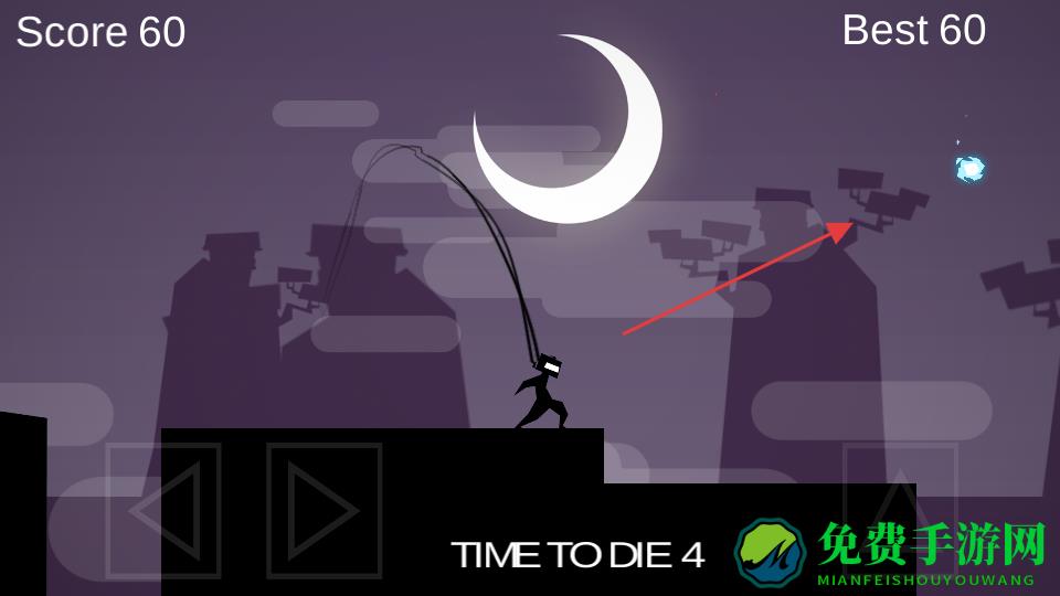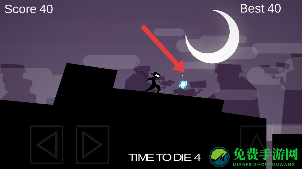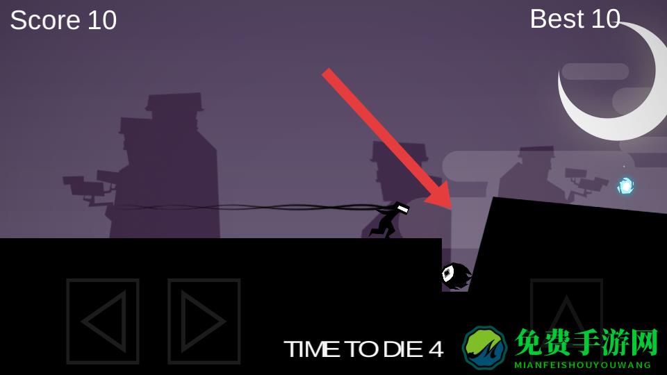 1、进入游戏,操控剪影角色,通过左侧方向键移动,右侧三角形按键跳跃,跨越地形黑色障碍。