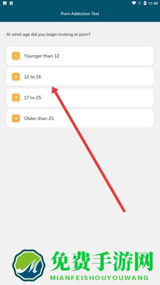 2、在测试的年龄问题界面,选择12-to-16选项,提交答案以推进Porn-Addiction-Test的测试进程。