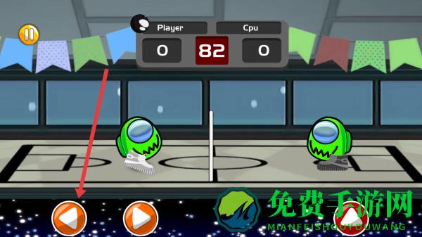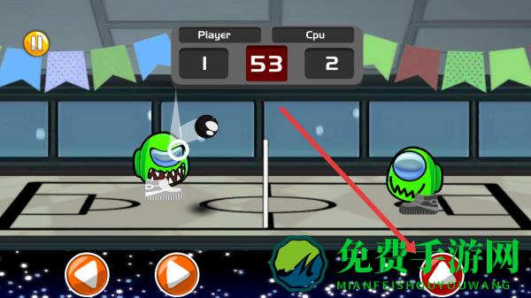 3、按照箭头提示,比赛中点击右侧红色按钮控制角色跳跃发射炸弹,瞄准区域得分,力争战胜CPU对手。