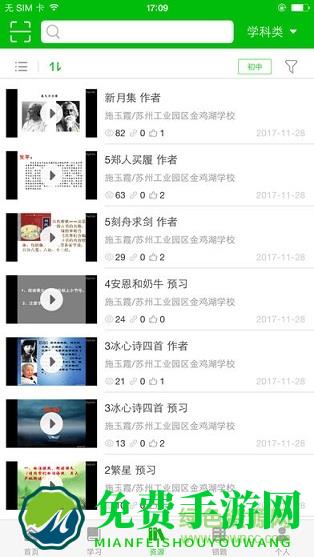 点击页面最下面一排主模块菜单的【资源】进入资源页面,分为学科类和特色类资源,包含视频、文档、测验、题库等资源。