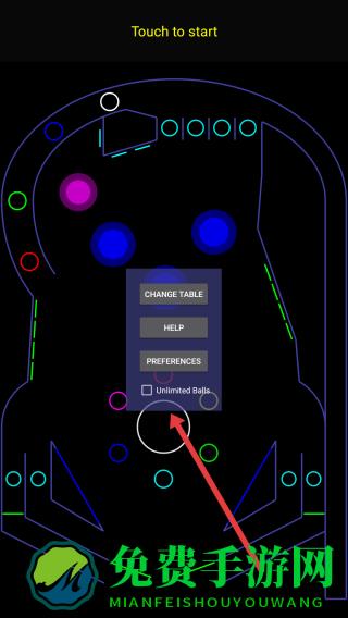 1、进入弹珠台游戏界面,点击Touch-to-start下方的圆形启动按钮,开启弹珠挑战,可按需选择CHANGE-TABLE等功能。