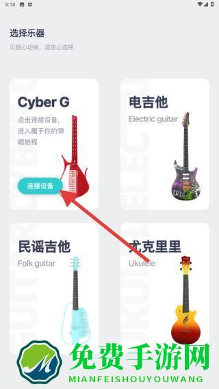 2、进入到软件内根据提示选择乐器,再进行连接设备,包含了:CyberG、电吉他、民谣吉他等。