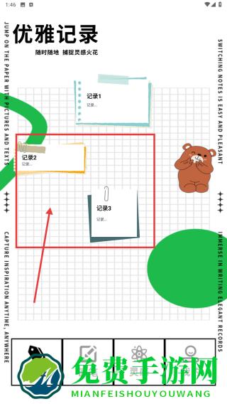 1、进入优雅记录界面,点击记录2、记录3等便签,可查看或编辑对应内容,随时捕捉灵感火花。