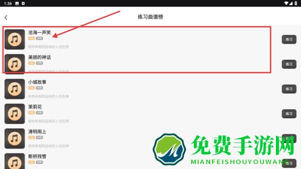 2、打开练习曲谱榜,选中想练习的曲目如沧海一声笑,点击进入练习模式,开展古筝弹奏练习。