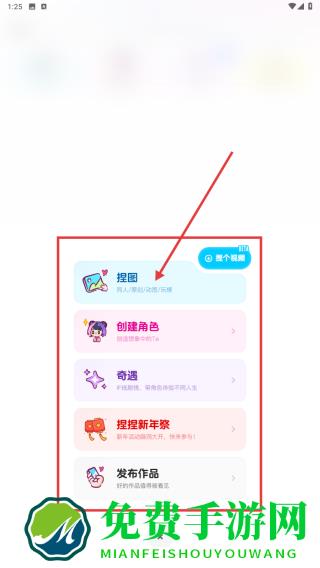 2、在功能选择页,点击捏图选项,进入捏图创作页面,可开始自定义形象创作操作句号。