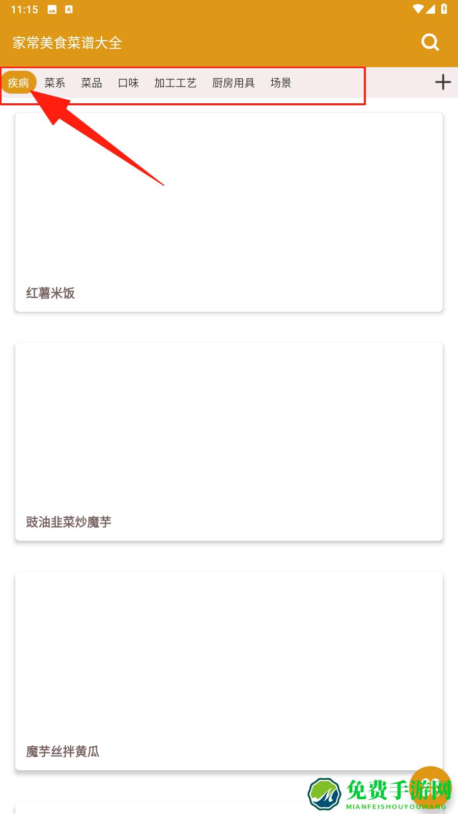 1、在首页,按疾病、菜系等分类筛选菜谱,浏览红薯米饭等菜品,点+管理分类,点击选择类别。