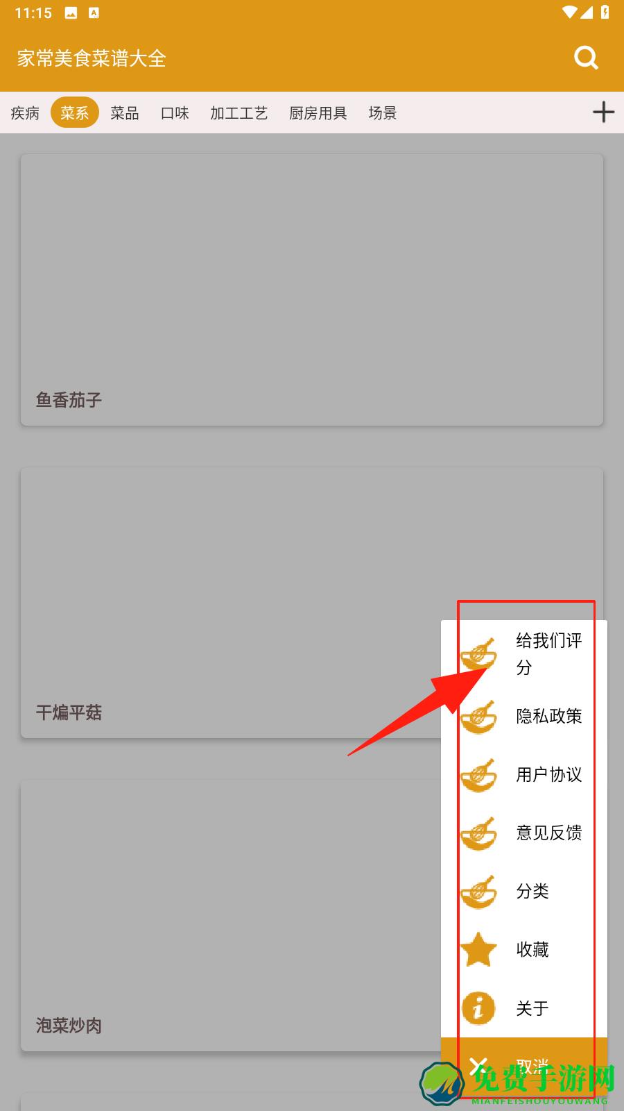 2、在功能菜单,进行评分、反馈意见,查看隐私政策,管理收藏、分类等设置,点击选择。