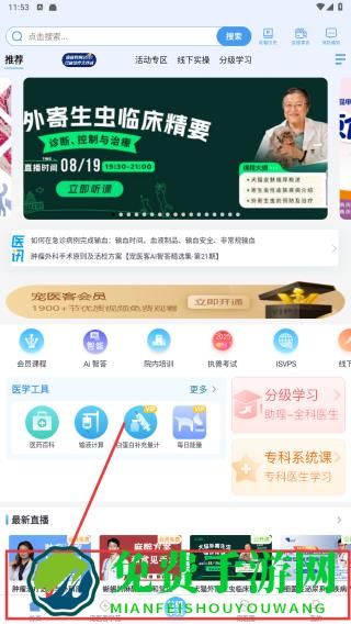 1、进入APP首页,点击底部医”栏,浏览最新直播等内容,找到感兴趣的医学直播课程,获取临床知识句号。