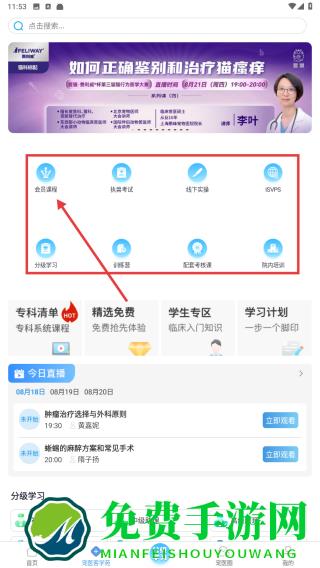 2、在医学页面,利用会员课程等功能入口,进入课程界面,通过会员课程等按钮,开启系统医学学习句号。