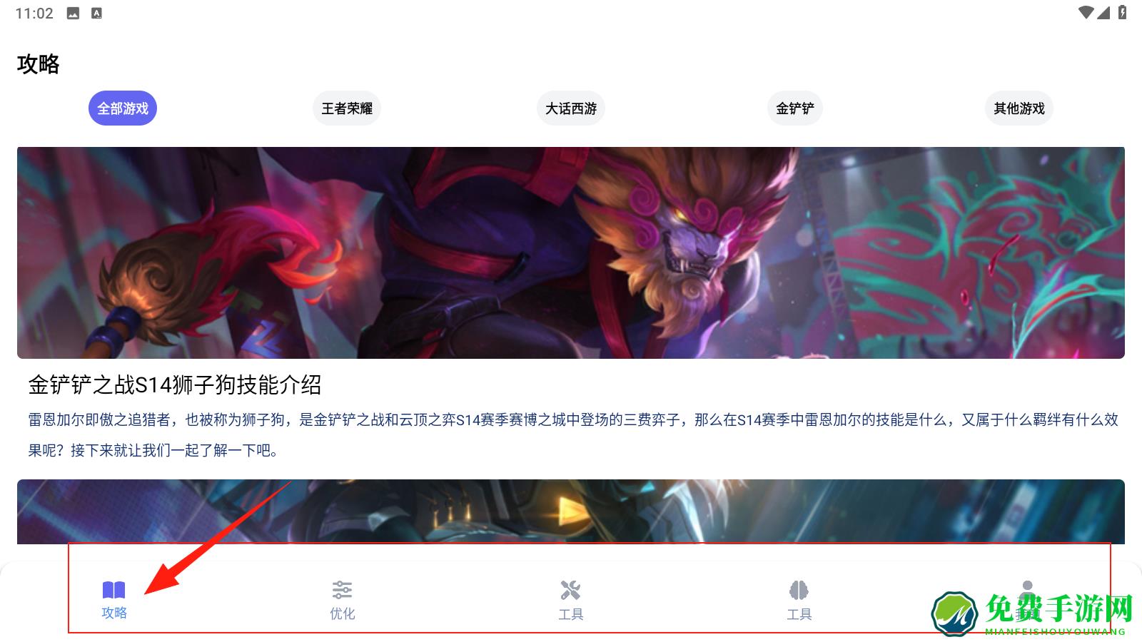 1、在攻略页,选游戏分类如金铲铲 ,查看英雄技能、玩法攻略,学习游戏技巧,点击攻略。
