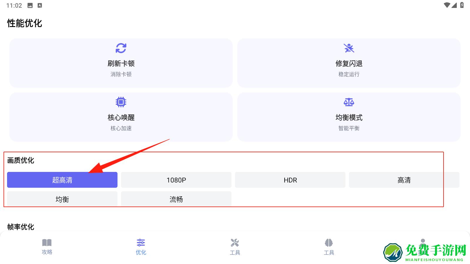 2、切换到优化页,选超高清等画质模式,用刷新卡顿等功能,优化游戏运行性能,点击选择画质。