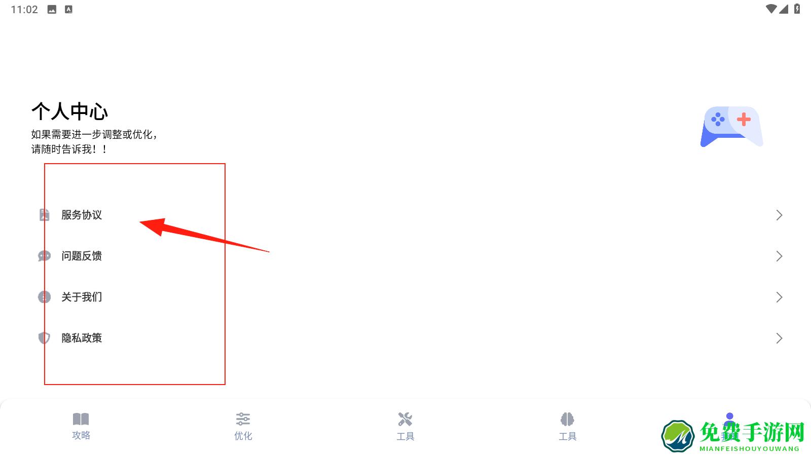 3、进入我的页面,查看服务协议、隐私政策,反馈问题,了解工具相关服务与规则,点击查看。