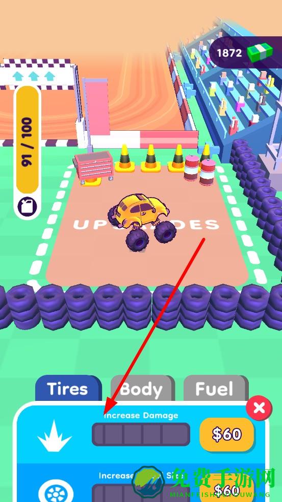 2、多维战车养成:从迷你改装车到怪兽战车,轮胎可换巨齿轮、车身叠加装甲,甚至给引擎装喷火特效,每一项改装都让“破坏机器”更具侵略性。