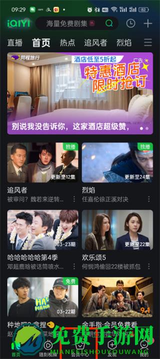 1、在免费手游下载安装爱奇艺app最新版本,打开软件就会看到首页、随刻视频、会员、发现、我的五个板块,在首页中有着直播、推荐、创世纪、如意、热点、电视剧等诸多频道。