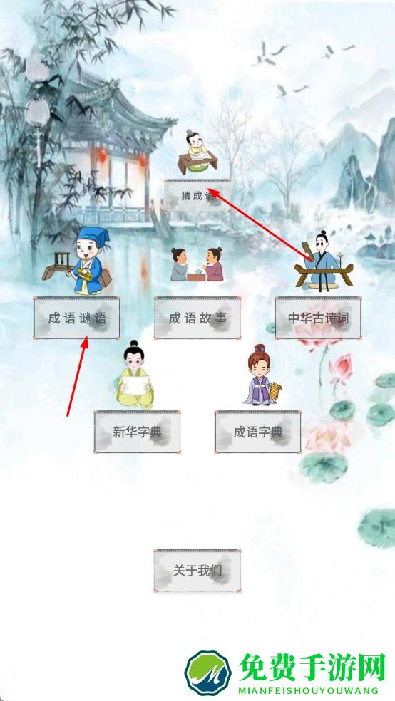 1、打开拼图成语大全,进入主界面,有猜成语,成语谜语等功能区,点击成语谜语,开启趣味猜谜学成语。