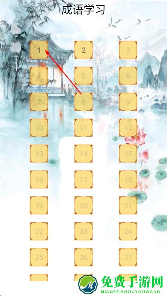 2、进入成语学习页,按数字序号选关卡1,通过答题闯关,在互动里加深成语知识记忆。