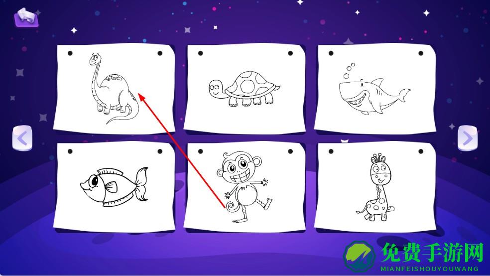 2、在分类页选主题,如植物、动物、建筑等,点击动物主题,进入动物涂色页,挑选恐龙、乌龟等线稿。
