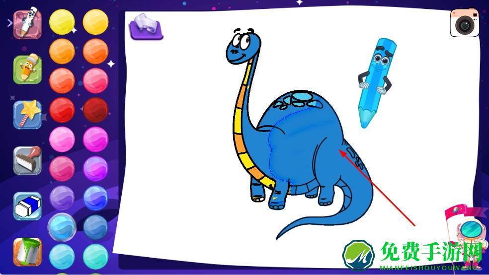 3、选恐龙线稿进入涂色界面,左侧有多样颜色、画笔工具,点击颜色球,再点恐龙身体部位,就能给恐龙涂色,完成创意绘画。