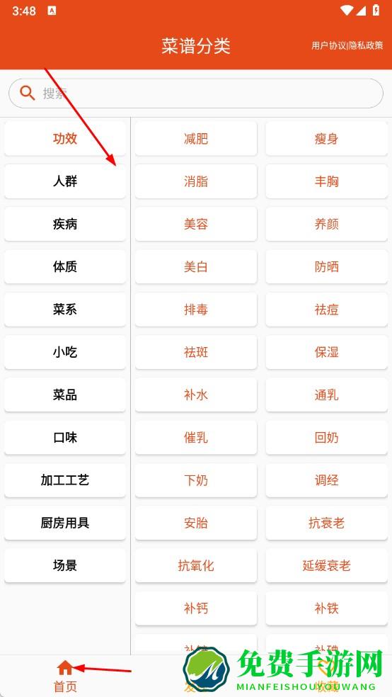 1、打开炎学味美,点击底部首页,进入菜谱分类页面,可按功效,人群等分类找美食,也用搜索栏精准搜。