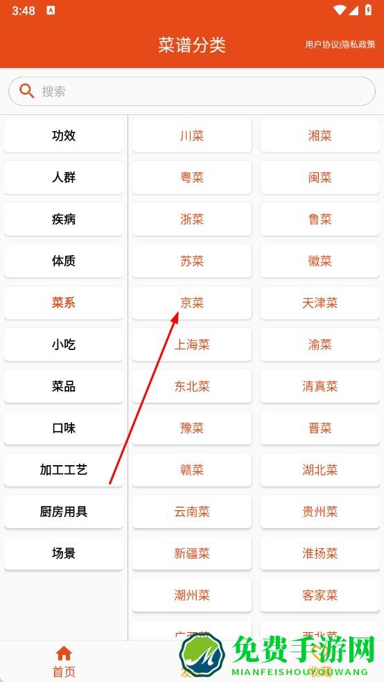 2、想按菜系学做菜,选左侧菜系分类,点击京菜等具体菜系,浏览对应菜谱,查看制作步骤。