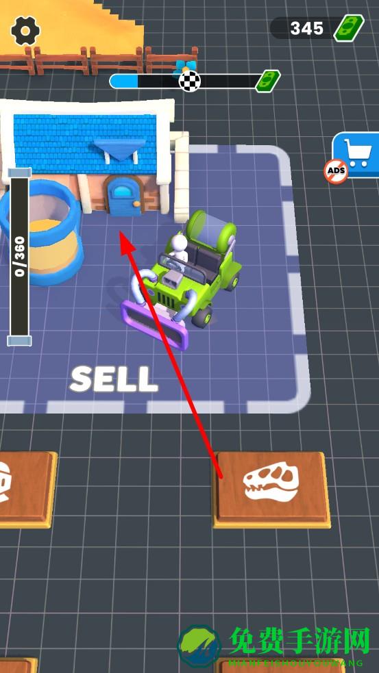2、进度条拉满后,返回基地,点击SELL出售收集的沙石,积攒金币,用于升级更多的属性。