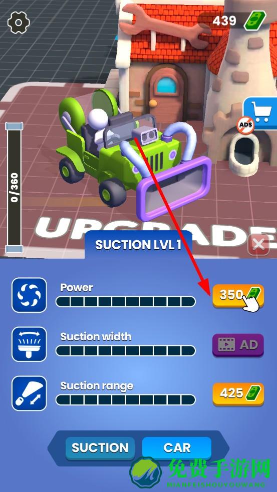 3、在升级界面消耗金币强化吸附功率、宽度与范围,或解锁新车型,如带双吸附口的工程车。
