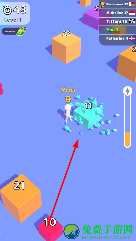 火柴人块切割是一款多人实时竞技游戏,玩家操控火柴人在色彩斑斓的方块战场穿梭,击碎标有数字的立方块,数字代表击破所需次数,每击碎一块,自身数字累加,同时与全球玩家同场竞争。通过预判方块数字、规划移动路线,在限时内疯狂收割方块,让自身数字飞速膨胀,最终以总分角逐排名。