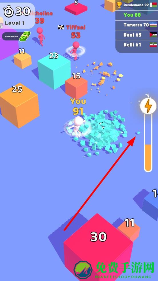 2、击打足够多的方块蓄力,激发闪电图标,瞬间击打速度增快,观察其他玩家行动轨迹,预判目标方块,进行抢占。